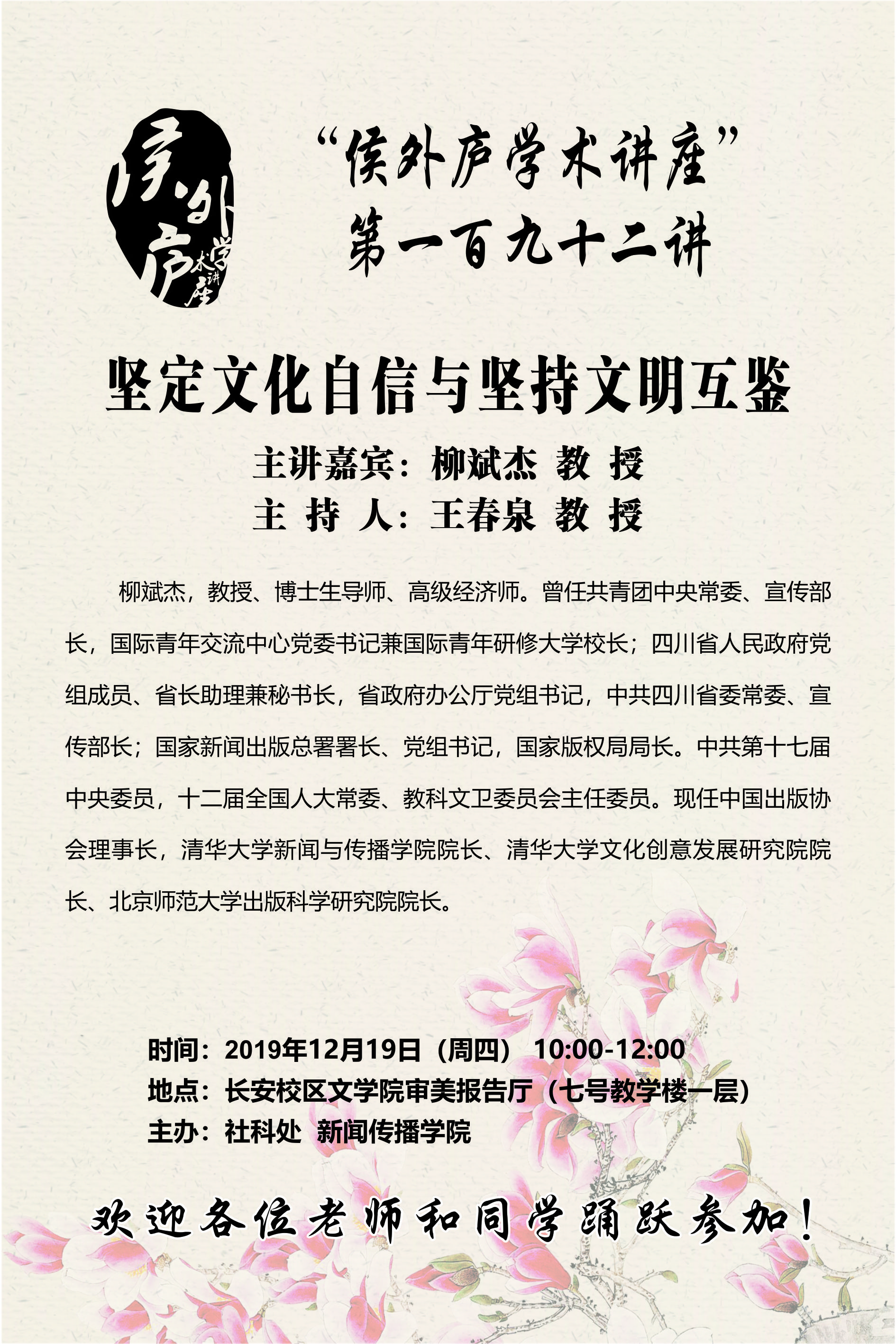 柳斌杰 教 授 “侯外庐学术讲座”第一百九十二讲:坚定文化自信与坚持文明互鉴 讲座时间 2019年12月19日(周四) 10:00-12:00 讲座地点 长安校区文学院审美报告厅(七号教学楼一层) 讲座人介绍 柳斌杰 教 授 讲座内容