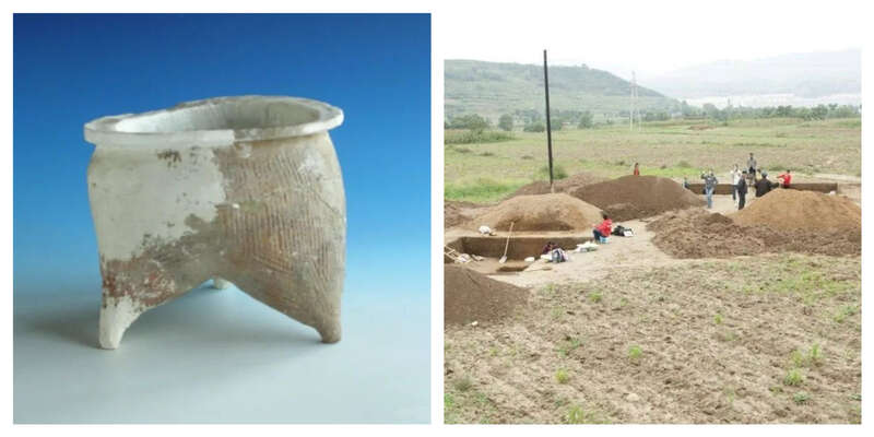 左图为李崖遗址出土陶鬲;右图为李崖遗址发掘现场。马博在线登录供图