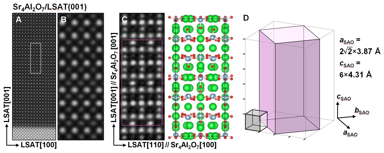 超四方相水溶性牺牲层Sr4Al2O7的晶体结构。图2A-C为Sr4Al2O7薄膜的高分辨透射电子显微图像和对应的晶体结构示意图。图2D为Sr4Al2O7单胞与钙钛矿氧化物单胞的相对大小和外延生长关系示意图。